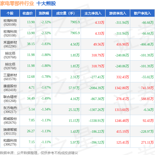 个股表现方面,家电零部件行业当日领跌股为宏海科技(920108),该股当日报收13.9,下跌2.32%,成交量7906.0,主力资金净流入4.33万元。宏海科技(920108)以下跌2.32%紧随其后,该股当日成交量7906.0,主力资金净流入4.33万元。除此之外,禾盛新材(002290)、拾比佰(920768)、拾比佰(920768)均进入当日熊股之列。具体个股列表见下表: