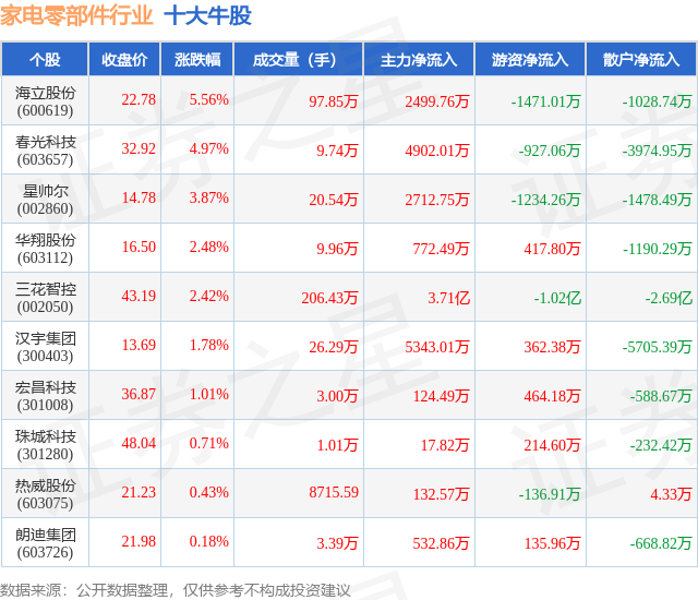 个股表现方面,家电零部件行业当日领涨股为海立股份(600619),该股当日报收22.78,上涨5.56%,成交量97.85万,主力资金净流入2499.76万元。春光科技(603657)以上涨4.97%紧随其后,该股当日成交量9.74万,主力资金净流入4902.01万元。除此之外,星帅尔(002860)、华翔股份(603112)、三花智控(002050)均进入当日牛股之列。具体个股列表见下表: