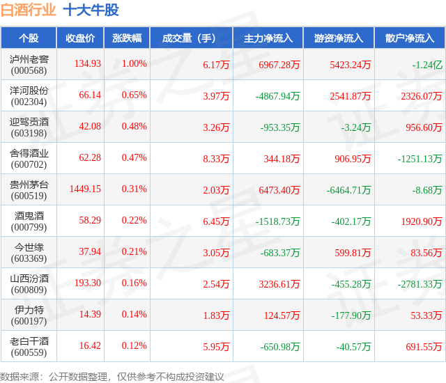 个股表现方面,白酒行业当日领涨股为泸州老窖(000568),该股当日报收134.93,上涨1.0%,成交量6.17万,主力资金净流入6967.28万元。洋河股份(002304)以上涨0.65%紧随其后,该股当日成交量3.97万,主力资金净流出4867.94万元。除此之外,迎驾贡酒(603198)、舍得酒业(600702)、贵州茅台(600519)均进入当日牛股之列。具体个股列表见下表: