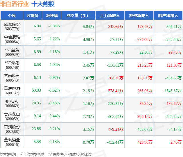 个股表现方面,非白酒行业当日领跌股为威龙股份(603779),该股当日报收6.94,下跌1.84%,成交量5.84万,主力资金净流入312.65万元。中信尼雅(600084)以下跌1.22%紧随其后,该股当日成交量4.98万,主力资金净流出37.21万元。除此之外,*ST兰黄(000929)、*ST椰岛(600238)、莫高股份(600543)均进入当日熊股之列。具体个股列表见下表: