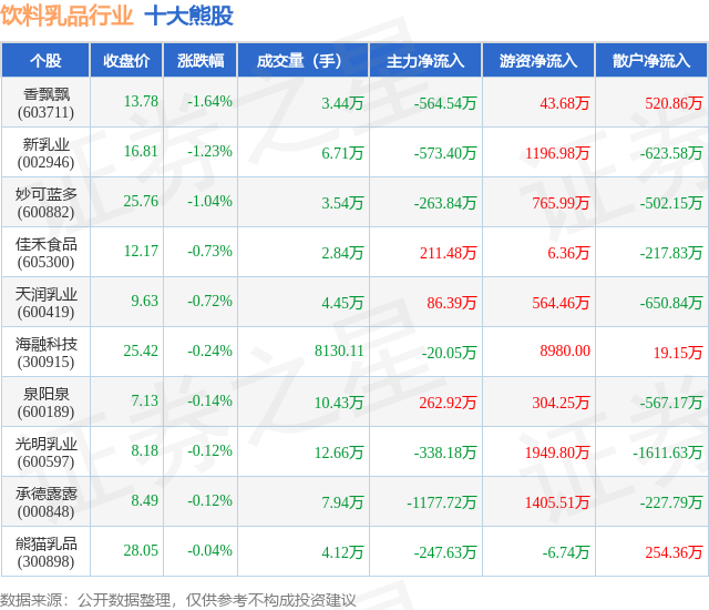 个股表现方面,饮料乳品行业当日领跌股为香飘飘(603711),该股当日报收13.78,下跌1.64%,成交量3.44万,主力资金净流出564.54万元。新乳业(002946)以下跌1.23%紧随其后,该股当日成交量6.71万,主力资金净流出573.4万元。除此之外,妙可蓝多(600882)、佳禾食品(605300)、天润乳业(600419)均进入当日熊股之列。具体个股列表见下表: