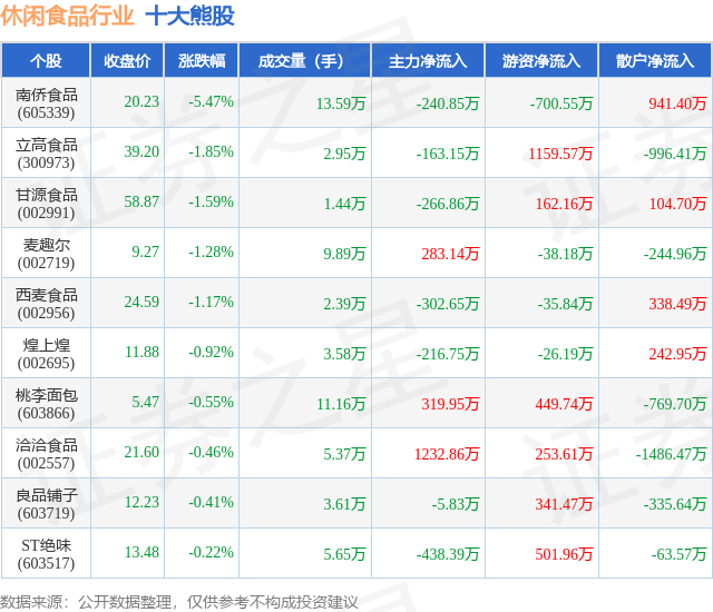 个股表现方面,休闲食品行业当日领跌股为南侨食品(605339),该股当日报收20.23,下跌5.47%,成交量13.59万,主力资金净流出240.85万元。立高食品(300973)以下跌1.85%紧随其后,该股当日成交量2.95万,主力资金净流出163.15万元。除此之外,甘源食品(002991)、麦趣尔(002719)、西麦食品(002956)均进入当日熊股之列。具体个股列表见下表: