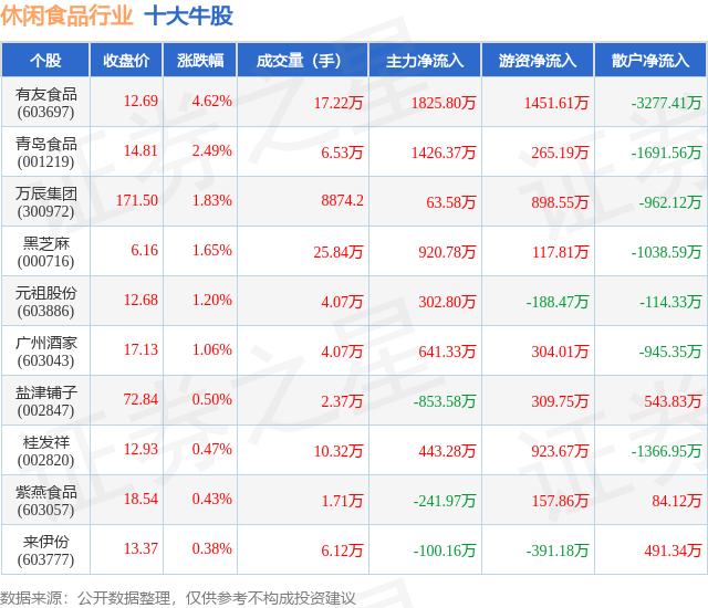 个股表现方面,休闲食品行业当日领涨股为有友食品(603697),该股当日报收12.69,上涨4.62%,成交量17.22万,主力资金净流入1825.8万元。青岛食品(001219)以上涨2.49%紧随其后,该股当日成交量6.53万,主力资金净流入1426.37万元。除此之外,万辰集团(300972)、黑芝麻(000716)、元祖股份(603886)均进入当日牛股之列。具体个股列表见下表: