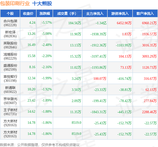 个股表现方面,包装印刷行业当日领跌股为合兴包装(002228),该股当日报收4.24,下跌5.57%,成交量184.56万,主力资金净流出1.34亿元。新宏泽(002836)以下跌5.08%紧随其后,该股当日成交量11.9万,主力资金净流出1938.39万元。除此之外,英联股份(002846)、鸿博股份(002229)、盛通股份(002599)均进入当日熊股之列。具体个股列表见下表: