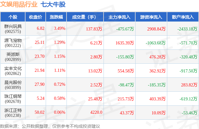 个股表现方面,文娱用品行业当日领涨股为群兴玩具(002575),该股当日报收6.82,上涨3.49%,成交量137.83万,主力资金净流出475.67万元。源飞宠物(001222)以上涨1.29%紧随其后,该股当日成交量6.21万,主力资金净流入1635.39万元。除此之外,英派斯(002899)、实丰文化(002862)、晨光股份(603899)均进入当日牛股之列。具体个股列表见下表: