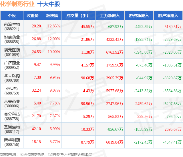 个股表现方面,化学制药行业当日领涨股为前沿生物(688221),该股当日报收20.2,上涨12.85%,成交量45.55万,主力资金净流出687.93万元。悦康药业(688658)以上涨12.0%紧随其后,该股当日成交量21.86万,主力资金净流入4323.43万元。除此之外,福元医药(601089)、广济药业(000952)、北大医药(000788)均进入当日牛股之列。具体个股列表见下表: