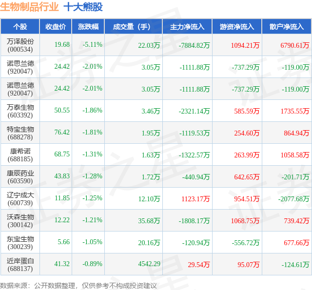 个股表现方面,生物制品行业当日领跌股为万泽股份(000534),该股当日报收19.68,下跌5.11%,成交量22.03万,主力资金净流出7884.82万元。诺思兰德(920047)以下跌2.01%紧随其后,该股当日成交量3.05万,主力资金净流出1111.88万元。除此之外,诺思兰德(920047)、万泰生物(603392)、特宝生物(688278)均进入当日熊股之列。具体个股列表见下表: