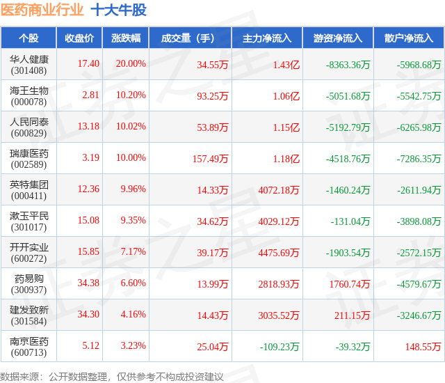 个股表现方面,医药商业行业当日领涨股为华人健康(301408),该股当日报收17.4,上涨20.0%,成交量34.55万,主力资金净流入1.43亿元。海王生物(000078)以上涨10.2%紧随其后,该股当日成交量93.25万,主力资金净流入1.06亿元。除此之外,人民同泰(600829)、瑞康医药(002589)、英特集团(000411)均进入当日牛股之列。具体个股列表见下表: