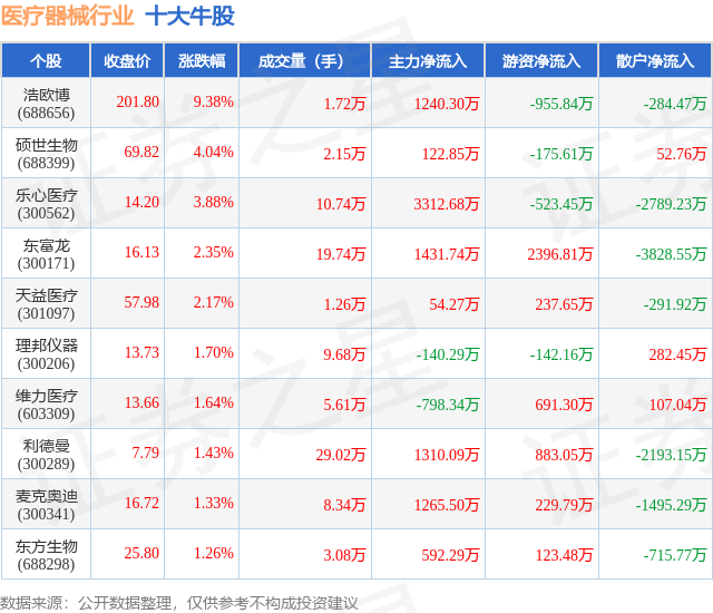 个股表现方面,医疗器械行业当日领涨股为浩欧博(688656),该股当日报收201.8,上涨9.38%,成交量1.72万,主力资金净流入1240.3万元。硕世生物(688399)以上涨4.04%紧随其后,该股当日成交量2.15万,主力资金净流入122.85万元。除此之外,乐心医疗(300562)、东富龙(300171)、天益医疗(301097)均进入当日牛股之列。具体个股列表见下表: