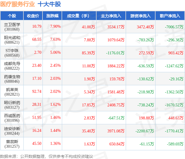 个股表现方面,医疗服务行业当日领涨股为兰卫医学(301060),该股当日报收10.79,上涨7.9%,成交量41.0万,主力资金净流入3534.17万元。阳光诺和(688621)以上涨7.63%紧随其后,该股当日成交量7.88万,主力资金净流入1079.64万元。除此之外,ST中珠(600568)、成都先导(688222)、药康生物(688046)均进入当日牛股之列。具体个股列表见下表: