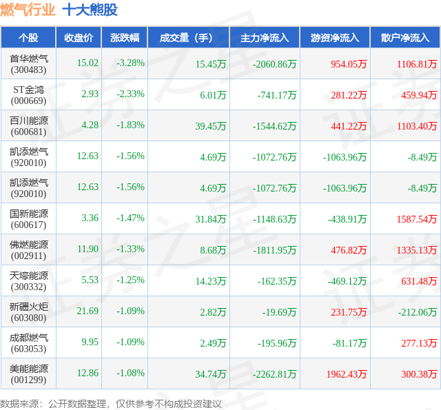 个股表现方面,燃气行业当日领跌股为首华燃气(300483),该股当日报收15.02,下跌3.28%,成交量15.45万,主力资金净流出2060.86万元。ST金鸿(000669)以下跌2.33%紧随其后,该股当日成交量6.01万,主力资金净流出741.17万元。除此之外,百川能源(600681)、凯添燃气(920010)、凯添燃气(920010)均进入当日熊股之列。具体个股列表见下表: