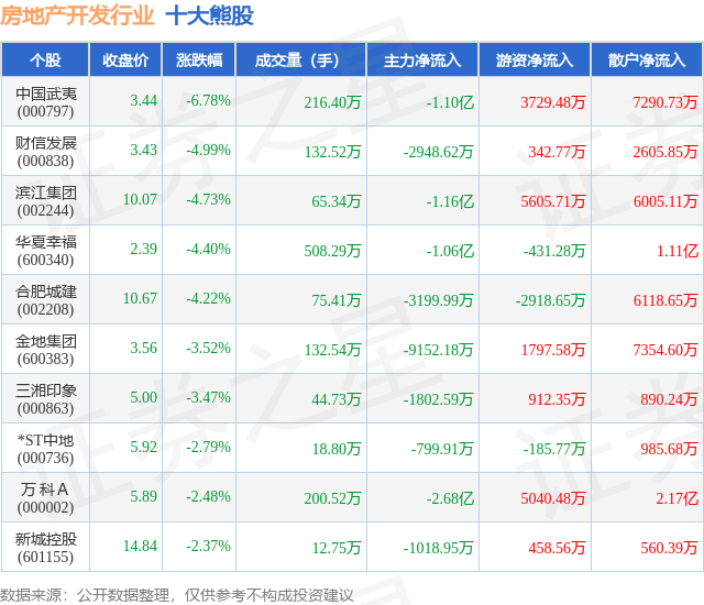 个股表现方面,房地产开发行业当日领跌股为中国武夷(000797),该股当日报收3.44,下跌6.78%,成交量216.4万,主力资金净流出1.1亿元。财信发展(000838)以下跌4.99%紧随其后,该股当日成交量132.52万,主力资金净流出2948.62万元。除此之外,滨江集团(002244)、华夏幸福(600340)、合肥城建(002208)均进入当日熊股之列。具体个股列表见下表: