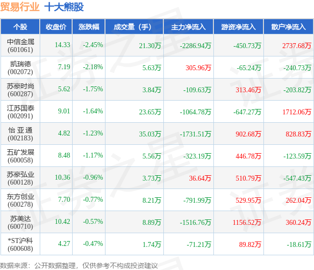 个股表现方面,贸易行业当日领跌股为中信金属(601061),该股当日报收14.33,下跌2.45%,成交量21.3万,主力资金净流出2286.94万元。凯瑞德(002072)以下跌2.18%紧随其后,该股当日成交量5.63万,主力资金净流入305.96万元。除此之外,苏豪时尚(600287)、江苏国泰(002091)、怡 亚 通(002183)均进入当日熊股之列。具体个股列表见下表: