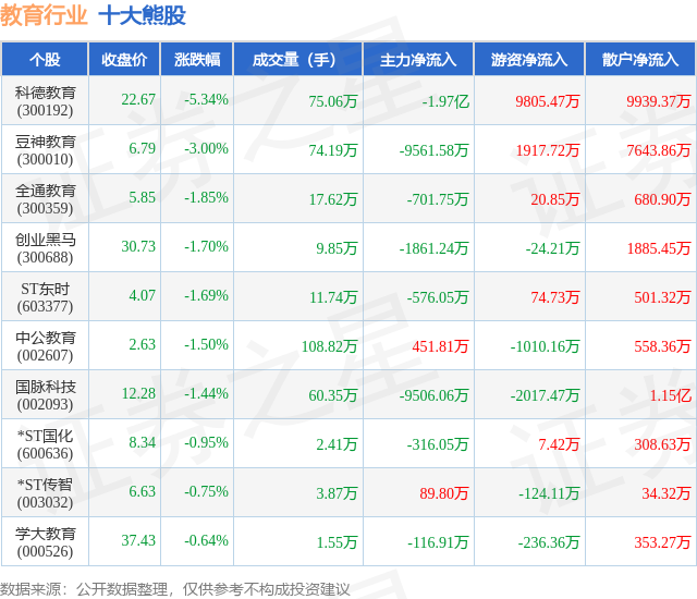 个股表现方面,教育行业当日领跌股为科德教育(300192),该股当日报收22.67,下跌5.34%,成交量75.06万,主力资金净流出1.97亿元。豆神教育(300010)以下跌3.0%紧随其后,该股当日成交量74.19万,主力资金净流出9561.58万元。除此之外,全通教育(300359)、创业黑马(300688)、ST东时(603377)均进入当日熊股之列。具体个股列表见下表: