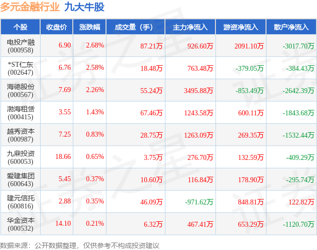 个股表现方面,多元金融行业当日领涨股为电投产融(000958),该股当日报收6.9,上涨2.68%,成交量87.21万,主力资金净流入926.6万元。*ST仁东(002647)以上涨2.58%紧随其后,该股当日成交量18.48万,主力资金净流入763.48万元。除此之外,海德股份(000567)、渤海租赁(000415)、越秀资本(000987)均进入当日牛股之列。具体个股列表见下表: