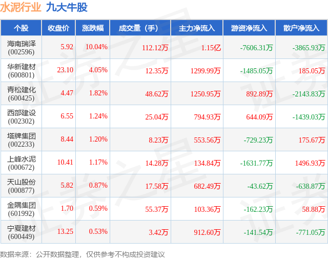 个股表现方面,水泥行业当日领涨股为海南瑞泽(002596),该股当日报收5.92,上涨10.04%,成交量112.12万,主力资金净流入1.15亿元。华新建材(600801)以上涨4.05%紧随其后,该股当日成交量12.35万,主力资金净流入1299.99万元。除此之外,青松建化(600425)、西部建设(002302)、塔牌集团(002233)均进入当日牛股之列。具体个股列表见下表: