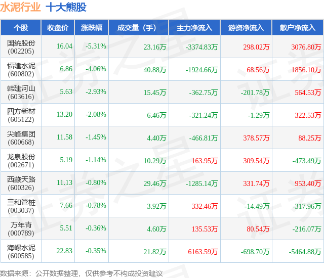 个股表现方面,水泥行业当日领跌股为国统股份(002205),该股当日报收16.04,下跌5.31%,成交量23.16万,主力资金净流出3374.83万元。福建水泥(600802)以下跌4.06%紧随其后,该股当日成交量40.88万,主力资金净流出1924.66万元。除此之外,韩建河山(603616)、四方新材(605122)、尖峰集团(600668)均进入当日熊股之列。具体个股列表见下表: