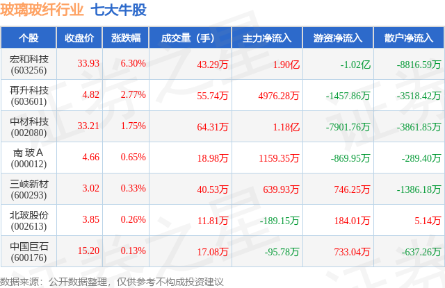 个股表现方面,玻璃玻纤行业当日领涨股为宏和科技(603256),该股当日报收33.93,上涨6.3%,成交量43.29万,主力资金净流入1.9亿元。再升科技(603601)以上涨2.77%紧随其后,该股当日成交量55.74万,主力资金净流入4976.28万元。除此之外,中材科技(002080)、南 玻A(000012)、三峡新材(600293)均进入当日牛股之列。具体个股列表见下表: