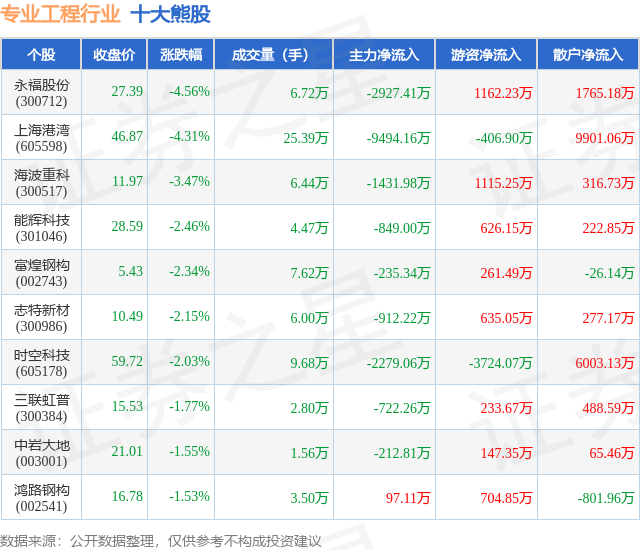 个股表现方面,专业工程行业当日领跌股为永福股份(300712),该股当日报收27.39,下跌4.56%,成交量6.72万,主力资金净流出2927.41万元。上海港湾(605598)以下跌4.31%紧随其后,该股当日成交量25.39万,主力资金净流出9494.16万元。除此之外,海波重科(300517)、能辉科技(301046)、富煌钢构(002743)均进入当日熊股之列。具体个股列表见下表:
