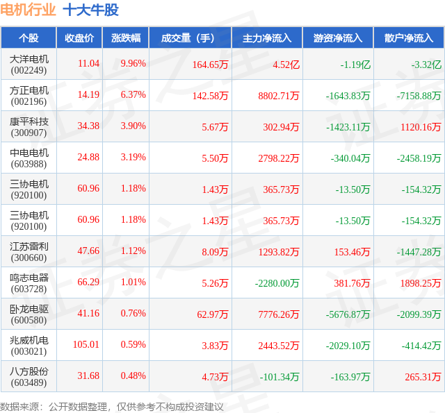 个股表现方面,电机行业当日领涨股为大洋电机(002249),该股当日报收11.04,上涨9.96%,成交量164.65万,主力资金净流入4.52亿元。方正电机(002196)以上涨6.37%紧随其后,该股当日成交量142.58万,主力资金净流入8802.71万元。除此之外,康平科技(300907)、中电电机(603988)、三协电机(920100)均进入当日牛股之列。具体个股列表见下表: