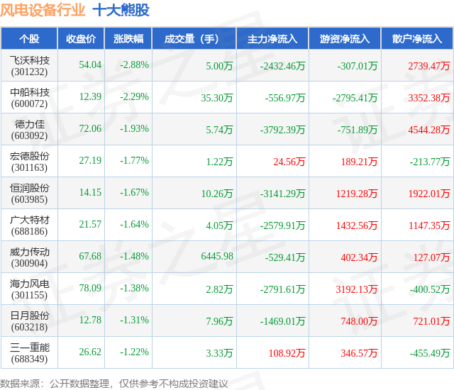 个股表现方面,风电设备行业当日领跌股为飞沃科技(301232),该股当日报收54.04,下跌2.88%,成交量5.0万,主力资金净流出2432.46万元。中船科技(600072)以下跌2.29%紧随其后,该股当日成交量35.3万,主力资金净流出556.97万元。除此之外,德力佳(603092)、宏德股份(301163)、恒润股份(603985)均进入当日熊股之列。具体个股列表见下表: