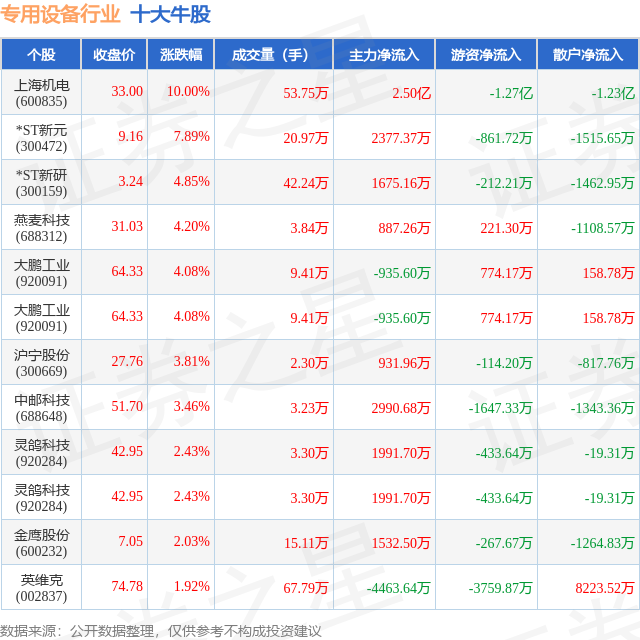 个股表现方面,专用设备行业当日领涨股为上海机电(600835),该股当日报收33.0,上涨10.0%,成交量53.75万,主力资金净流入2.5亿元。*ST新元(300472)以上涨7.89%紧随其后,该股当日成交量20.97万,主力资金净流入2377.37万元。除此之外,*ST新研(300159)、燕麦科技(688312)、大鹏工业(920091)均进入当日牛股之列。具体个股列表见下表: