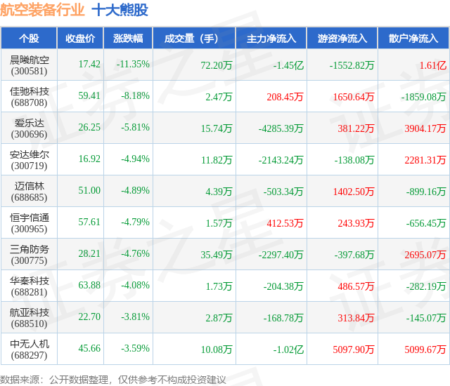 个股表现方面,航空装备行业当日领跌股为晨曦航空(300581),该股当日报收17.42,下跌11.35%,成交量72.2万,主力资金净流出1.45亿元。佳驰科技(688708)以下跌8.18%紧随其后,该股当日成交量2.47万,主力资金净流入208.45万元。除此之外,爱乐达(300696)、安达维尔(300719)、迈信林(688685)均进入当日熊股之列。具体个股列表见下表: