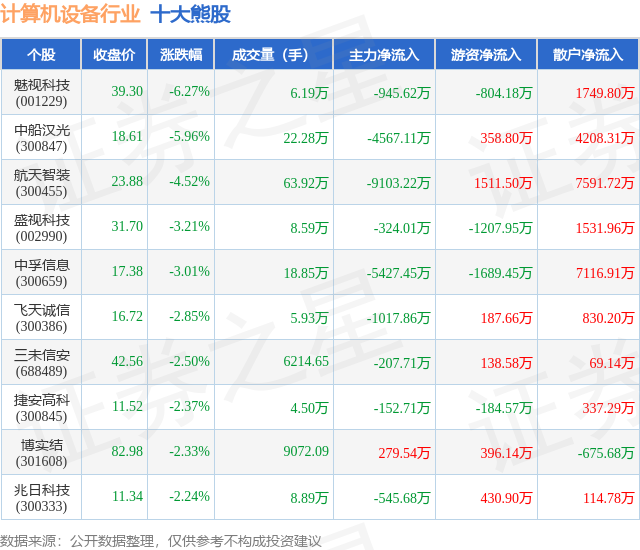 个股表现方面,计算机设备行业当日领跌股为魅视科技(001229),该股当日报收39.3,下跌6.27%,成交量6.19万,主力资金净流出945.62万元。中船汉光(300847)以下跌5.96%紧随其后,该股当日成交量22.28万,主力资金净流出4567.11万元。除此之外,航天智装(300455)、盛视科技(002990)、中孚信息(300659)均进入当日熊股之列。具体个股列表见下表: