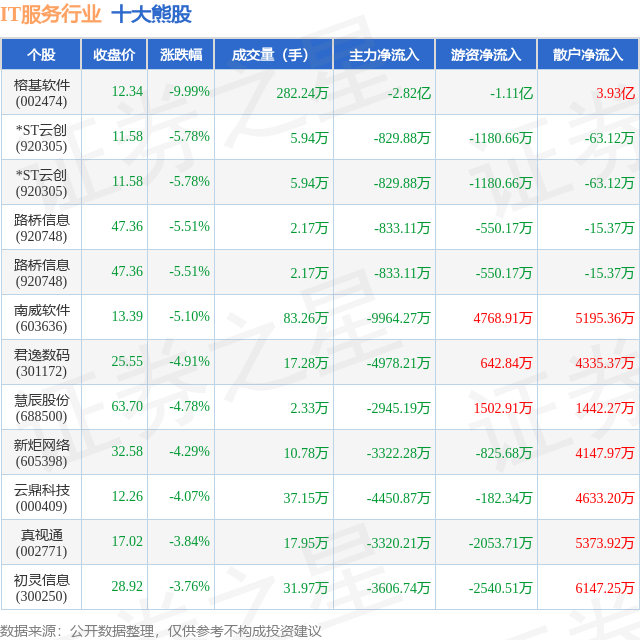 个股表现方面,IT服务行业当日领跌股为榕基软件(002474),该股当日报收12.34,下跌9.99%,成交量282.24万,主力资金净流出2.82亿元。*ST云创(920305)以下跌5.78%紧随其后,该股当日成交量5.94万,主力资金净流出829.88万元。除此之外,*ST云创(920305)、路桥信息(920748)、路桥信息(920748)均进入当日熊股之列。具体个股列表见下表: