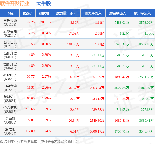 个股表现方面,软件开发行业当日领涨股为三维天地(301159),该股当日报收47.26,上涨20.01%,成交量8.3万,主力资金净流入1.11亿元。延华智能(002178)以上涨10.04%紧随其后,该股当日成交量67.09万,主力资金净流入2.58亿元。除此之外,石基信息(002153)、恒拓开源(920415)、恒拓开源(920415)均进入当日牛股之列。具体个股列表见下表: