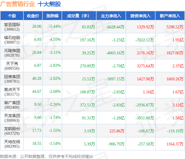 个股表现方面,广告营销行业当日领跌股为宣亚国际(300612),该股当日报收20.0,下跌5.44%,成交量65.83万,主力资金净流出6628.44万元。福石控股(300071)以下跌4.55%紧随其后,该股当日成交量197.16万,主力资金净流出1.25亿元。除此之外,元隆雅图(002878)、天下秀(600556)、因赛集团(300781)均进入当日熊股之列。具体个股列表见下表: