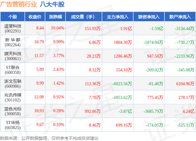个股表现方面,广告营销行业当日领涨股为遥望科技(002291),该股当日报收8.44,上涨10.04%,成交量151.93万,主力资金净流入1.91亿元。新 华 都(002264)以上涨9.99%紧随其后,该股当日成交量6.86万,主力资金净流入1804.3万元。除此之外,旗天科技(300061)、ST联合(600358)、浙文互联(600986)均进入当日牛股之列。具体个股列表见下表: