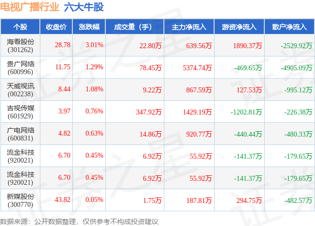 个股表现方面,电视广播行业当日领涨股为海看股份(301262),该股当日报收28.78,上涨3.01%,成交量22.8万,主力资金净流入639.56万元。贵广网络(600996)以上涨1.29%紧随其后,该股当日成交量78.45万,主力资金净流入5374.74万元。除此之外,天威视讯(002238)、吉视传媒(601929)、广电网络(600831)均进入当日牛股之列。具体个股列表见下表: