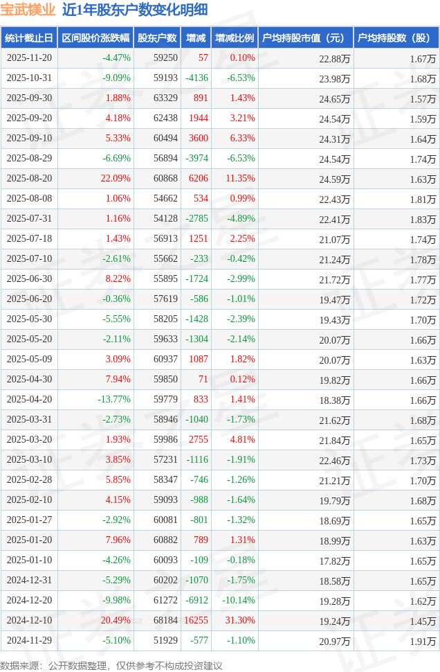 从股价来看,2025年10月31日至2025年11月20日,宝武镁业区间跌幅为4.47%,在此期间股东户数增加57.0户,增幅为0.1%。