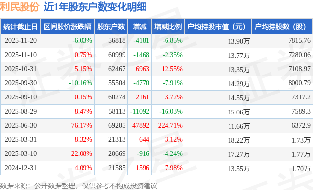 从股价来看,2025年11月10日至2025年11月20日,利民股份区间跌幅为6.03%,在此期间股东户数减少4181.0户,减幅为6.85%。