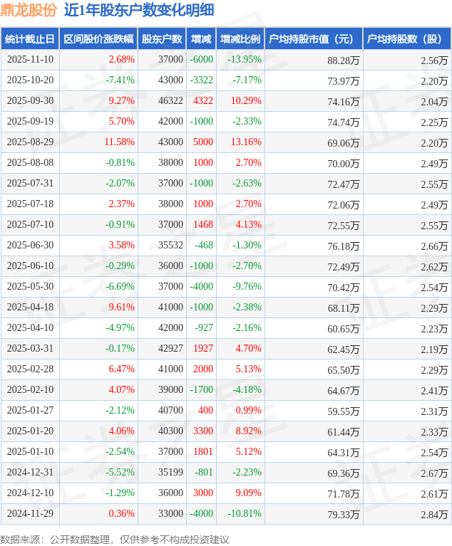 证券之星消息,近日鼎龙股份披露,截至2025年11月10日公司股东户数为3.7万户,较10月20日减少6000.0户,减幅为13.95%。户均持股数量由上期的2.2万股增加至2.56万股,户均持股市值为88.28万元。