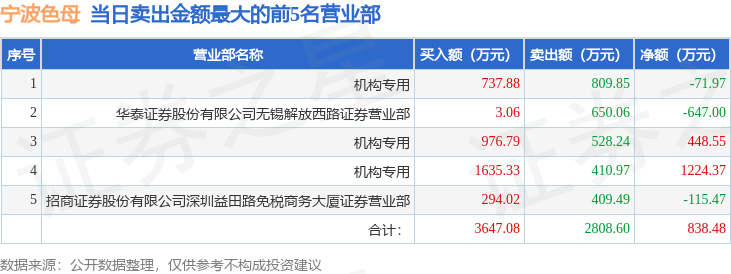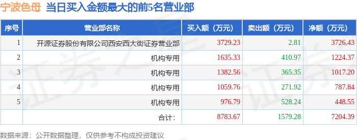 证券之星消息,沪深交易所2025年11月26日公布的交易公开信息显示,宁波色母(301019)因日涨幅达到15%的前5只证券登上龙虎榜。此次是近5个交易日内第1次上榜。