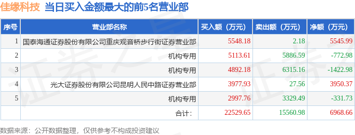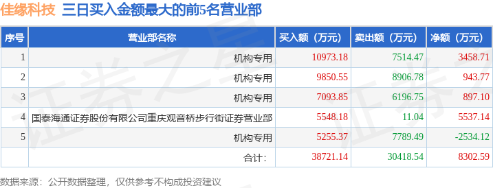 证券之星消息,沪深交易所2025年11月26日公布的交易公开信息显示,佳缘科技(301117)因日换手率达到30%的前5只证券,连续三个交易日内,涨幅偏离值累计达到30%的证券登上龙虎榜。此次是近5个交易日内第2次上榜。