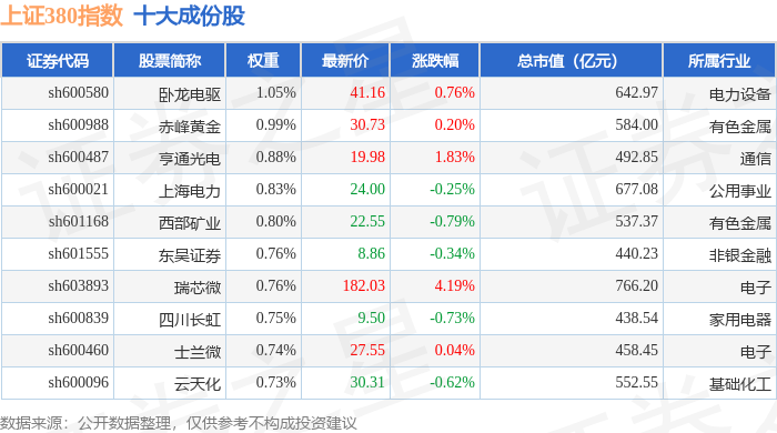 证券之星消息,11月26日,上证380(000009)指数报收于6210.99点,跌0.11%,成交1222.77亿元,换手率1.09%。当日该指数成份股中,上涨的有129家,华峰铝业以6.73%的涨幅领涨,下跌的有244家,国博电子以6.27%的跌幅领跌。