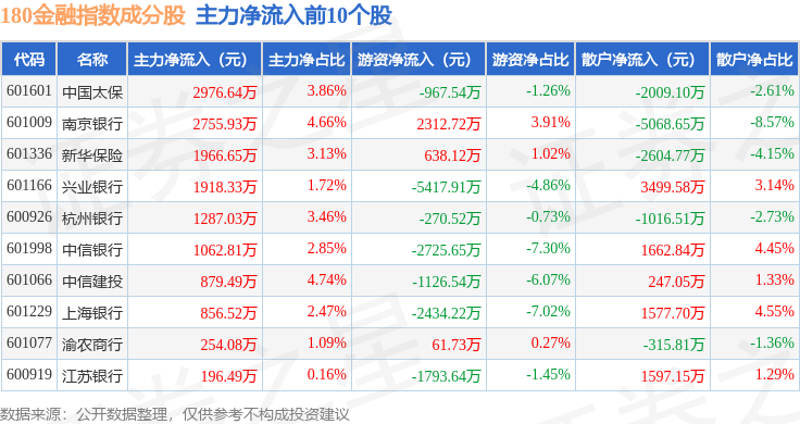 资金流向方面,180金融(000018)指数成份股当日主力资金净流出合计22.04亿元,游资资金净流入合计10.54亿元,散户资金净流入合计11.5亿元。成份股资金流向详情见下表: