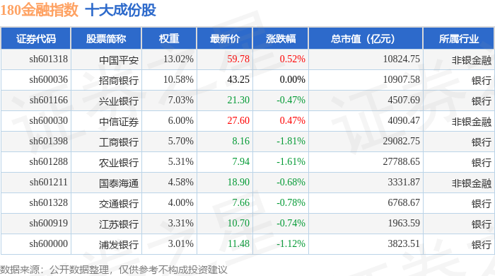 证券之星消息,11月26日,180金融(000018)指数报收于5803.44点,跌0.51%,成交347.81亿元,换手率0.26%。当日该指数成份股中,上涨的有7家,沪农商行以0.56%的涨幅领涨,下跌的有30家,工商银行以1.81%的跌幅领跌。