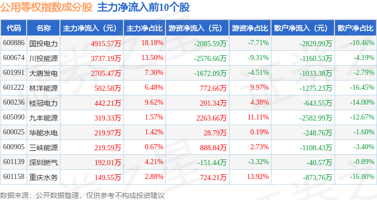 资金流向方面,公用等权(000079)指数成份股当日主力资金净流出合计1.96亿元,游资资金净流入合计1.3亿元,散户资金净流入合计6664.6万元。成份股资金流向详情见下表: