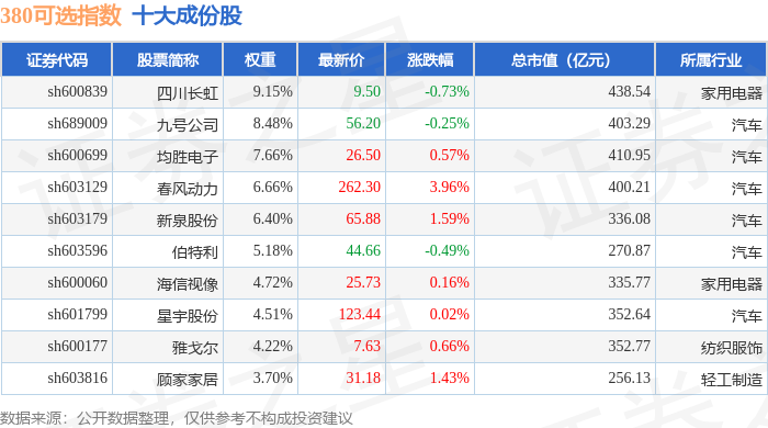 证券之星消息,11月26日,380可选(000107)指数报收于5507.66点,涨0.36%,成交80.52亿元,换手率0.95%。当日该指数成份股中,上涨的有16家,春风动力以3.96%的涨幅领涨,下跌的有18家,长白山以1.94%的跌幅领跌。