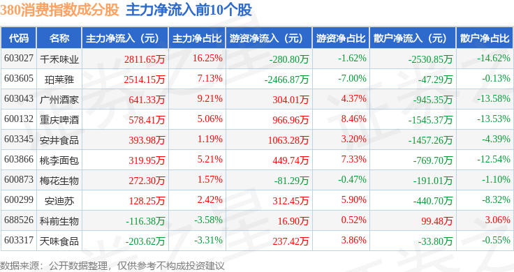 资金流向方面,380消费(000108)指数成份股当日主力资金净流出合计3768.2万元,游资资金净流入合计5727.16万元,散户资金净流出合计1958.97万元。成份股资金流向详情见下表: