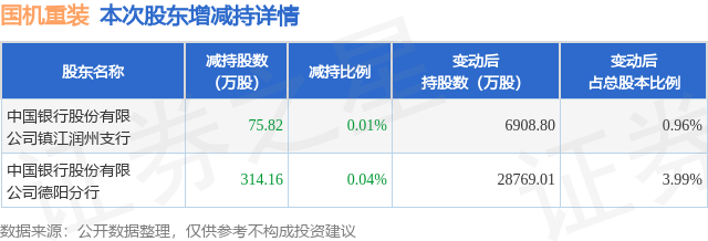 证券之星消息,11月26日国机重装发布公告《国机重装:国机重装关于合计持股5%以上股东及其一致行动人减持计划实施完毕暨减持结果的公告》,其股东中国银行股份有限公司镇江润州支行、中国银行股份有限公司德阳分行于2025年11月15日至2025年11月24日间合计减持389.98万股,占公司目前总股本的0.0541%,变动期间该股股价下跌8.08%,截止11月24日收盘报3.3元。