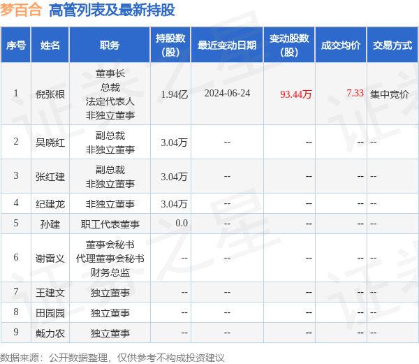 梦百合的高管列表及最新持股情况如下: