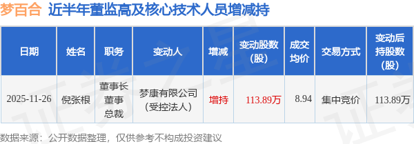 证券之星消息,根据11月26日市场公开信息、上市公司公告及交易所披露数据整理,梦百合(603313)最新董监高及相关人员股份变动情况:2025年11月26日公司董事长,董事,总裁倪张根共增持公司股份113.89万股,占公司总股本为0.1996%。变动期间公司股价下跌0.56%,11月26日当日收盘报8.93元。