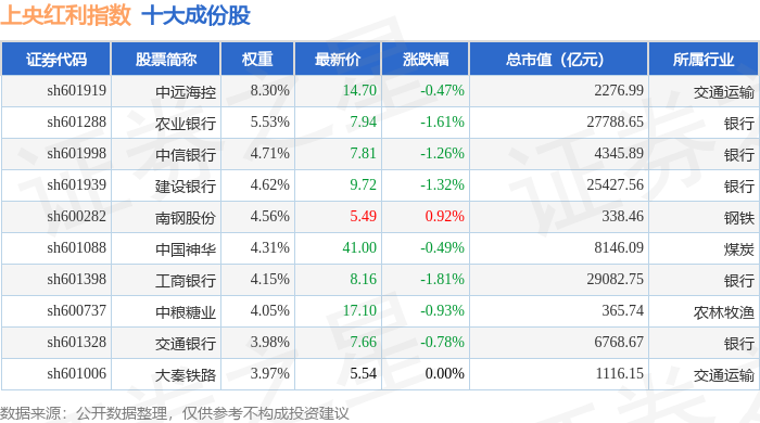 上央红利(000152)指数十大成份股详情如下:
