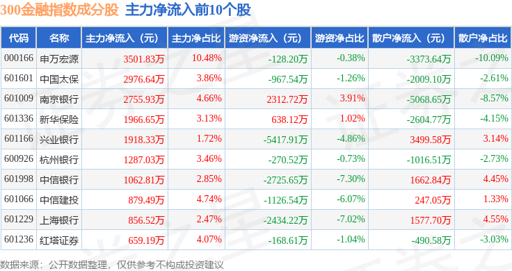 资金流向方面,300金融(000914)指数成份股当日主力资金净流出合计31.1亿元,游资资金净流入合计12.43亿元,散户资金净流入合计18.67亿元。成份股资金流向详情见下表:
