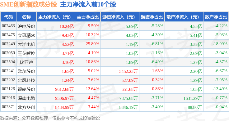 资金流向方面,SME创新(399017)指数成份股当日主力资金净流入合计24.79亿元,游资资金净流出合计14.84亿元,散户资金净流出合计9.95亿元。成份股资金流向详情见下表: